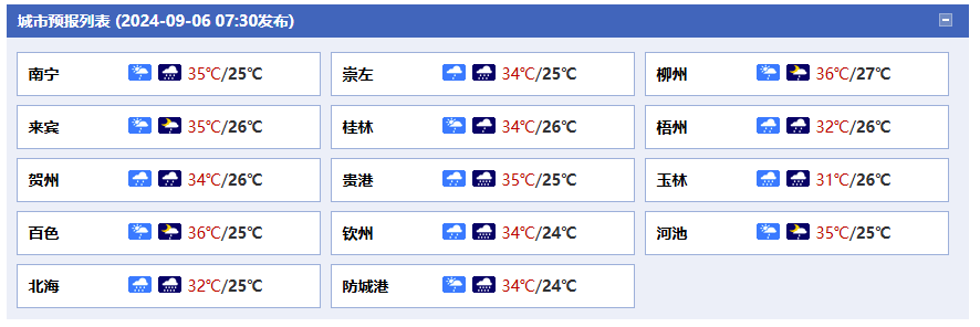 南寧市:今天白天多云有雷陣雨、局地大雨,今天晚上中到大雨、局地暴雨,東北風(fēng)3級、陣風(fēng)6~7級,最高氣溫35℃,最低氣溫25℃。