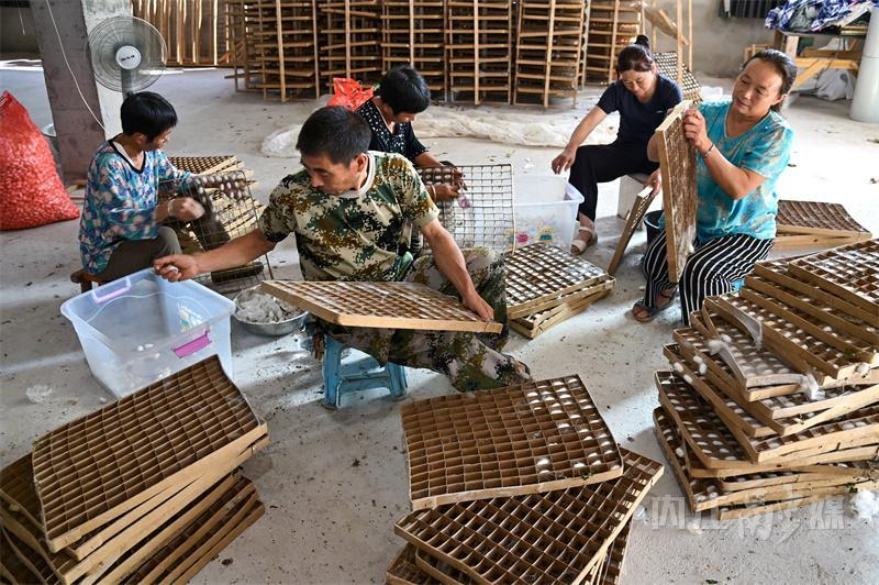 9月5日,內(nèi)江市東興區(qū)雙橋鎮(zhèn)雙流村,東興區(qū)鑫絲路養(yǎng)殖專業(yè)合作社,蠶農(nóng)正在采摘蠶繭