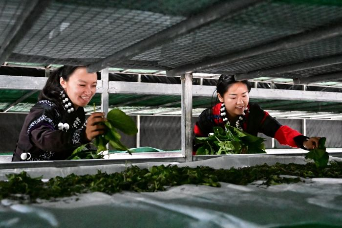 寧南縣蠶?,F(xiàn)代農(nóng)業(yè)園區(qū)內(nèi)工作人員正在放置桑葉