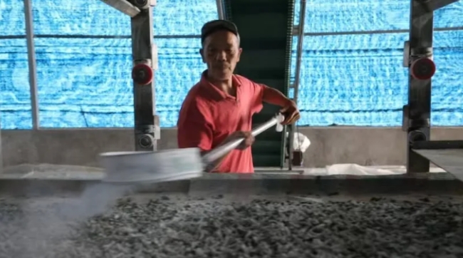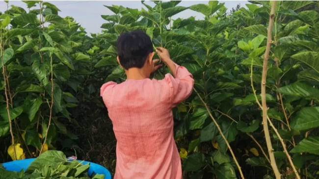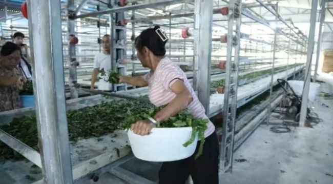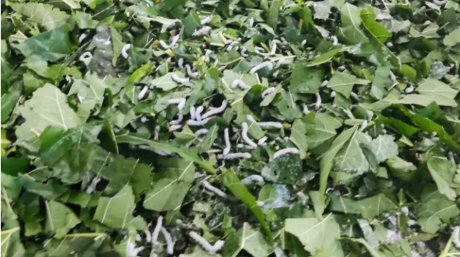 桑蠶養(yǎng)殖基地內(nèi),第五批蠶寶寶們正嗷嗷待哺,小小的它們每日要消耗桑葉5000余斤。