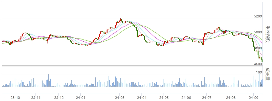 今日(2024年09月12日,周四)中國繭絲綢交易市場生絲電子指數(shù)下跌0.72%報(bào)收于4648.67點(diǎn)。B絲2022D(商檢4A級生絲):240925合約下跌0.33萬元報(bào)收于47.10萬元;250325合約下跌0.51萬元報(bào)收于45.63萬元;250925合約下跌0.18萬元報(bào)收于45.69萬元。