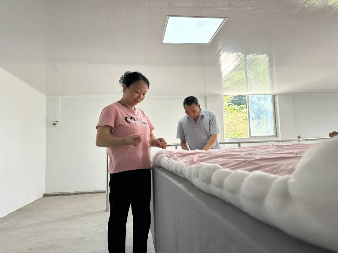 在村集體經(jīng)濟(jì)合作社的統(tǒng)一管理下,雙橋村干部帶頭主動(dòng)學(xué)習(xí)蠶絲被制作技藝,從蠶種培育、飼養(yǎng)管理到蠶繭收烘、疾病防治,每一個(gè)環(huán)節(jié)都力求精益求精。為村集體桑蠶產(chǎn)業(yè)的發(fā)展奠定了堅(jiān)實(shí)基礎(chǔ)。