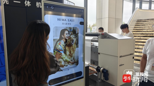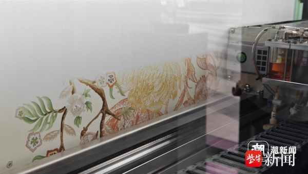 反復篩選后,楠姐和小餅選定了其中一款設計稿,并提交了訂單。緊接著,一旁那臺輕巧的機器在師傅的熟練操作下,開始緩緩運轉起來。隨著“打印機”的噴頭在綢布上來回穿梭,色彩逐漸豐富,圖案變得形象生動。就這樣,定制的圖案就這樣一點點、完整地呈現在眾人眼前。