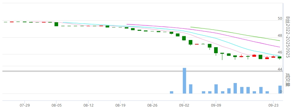 今日(2024年09月24日,周二)中國(guó)繭絲綢交易市場(chǎng)生絲電子指數(shù)下跌0.10%報(bào)收于4566.83點(diǎn)。B絲2022D(商檢4A級(jí)生絲):240325合約下跌0.06萬元報(bào)收于45.93萬元;250925合約下跌0.21萬元報(bào)收于45.54萬元。