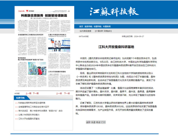 為慶祝第7個中國農(nóng)民豐收節(jié),弘揚傳承中華優(yōu)秀農(nóng)耕文化,9月22日,由江蘇科技大學、中國農(nóng)業(yè)科學院桑蠶科學研究中心聯(lián)合主辦的2024年中國農(nóng)民豐收節(jié)蠶桑種質(zhì)資源科普開放日活動在江蘇科技大學蠶桑科研基地舉行。