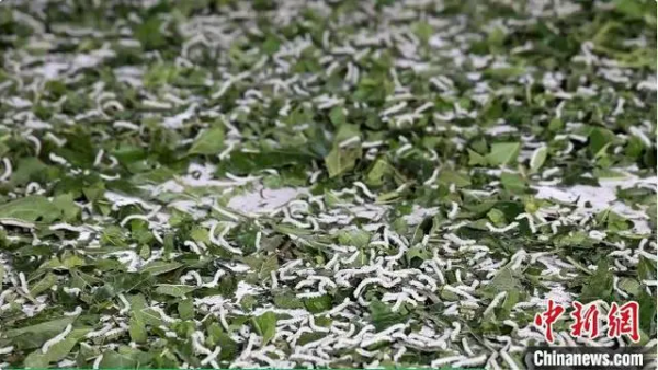 “蠶房每天都要消毒,蠶越長越大吃得也越多,快吐絲的時候,一天要放好幾次桑葉。在這里務(wù)工一天能賺100元?!闭谖剐Q的工人唐雪花說。