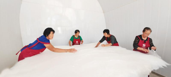 8月30,在延川縣關莊鎮(zhèn)楊家坪村蠶桑養(yǎng)殖示范基地,4名婦女正在為一戶蠶農(nóng)加工蠶絲被,他們拉開一塊塊銀光閃閃的蠶絲均勻地疊壓在一起,不一會兒,一塊輕盈柔滑的蠶絲被呈現(xiàn)在眼前。