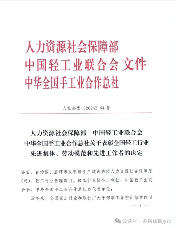 絲企榮譽丨湖州金裕絲綢科技有限公司織造車間乙班獲“全國輕工業(yè)先進集體”榮譽