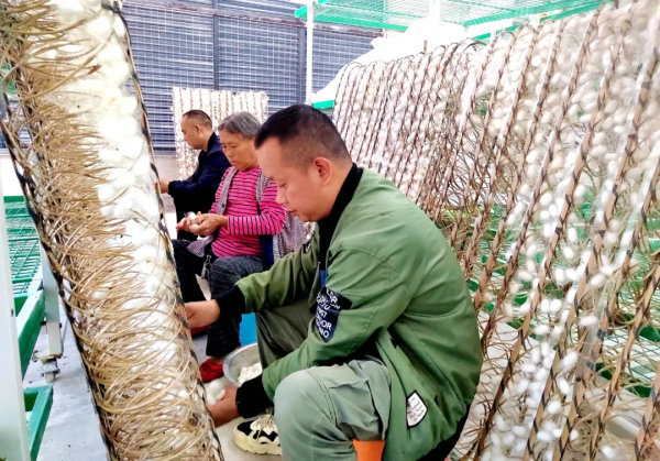 “這一季晚秋蠶總共喂了5張,經(jīng)過一個(gè)多月的精心喂養(yǎng),結(jié)出的蠶繭顏色好、個(gè)頭也大,產(chǎn)量在200公斤左右,又是一個(gè)豐收季?!蓖醺墩赂嬖V記者,他使用的大蠶養(yǎng)殖工廠,不僅有良好的通風(fēng)條件,還配套有切桑機(jī)、軌道式升降省力化蠶臺、自動(dòng)旋轉(zhuǎn)方格蔟和自動(dòng)采繭機(jī)等先進(jìn)機(jī)具設(shè)備,養(yǎng)蠶更加科學(xué)高效。今年的蠶繭價(jià)格較為喜人,加上有“小蠶共育技術(shù)”支撐,養(yǎng)蠶效益大大提升?!敖衲?個(gè)批次總共養(yǎng)了30多張蠶,總收入超過了10萬元。”看著眼前白花花的蠶繭,王付章喜上眉梢。
