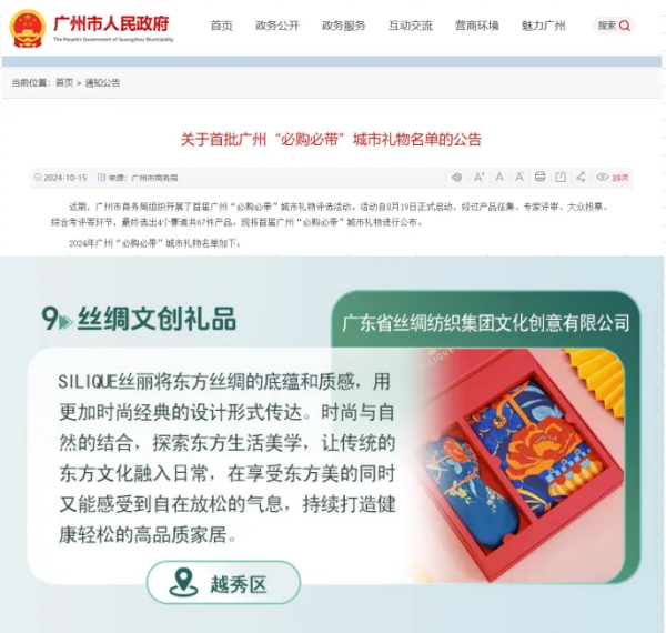 10月15日,由廣州市商務(wù)局組織,并邀請主管部門、行業(yè)專家、媒體代表等組成“必購必帶”評審委員會(huì)評選,并結(jié)合大眾選票的首批廣州“必購必帶”城市禮物名單公布。廣東省絲綢紡織集團(tuán)(以下簡稱絲紡集團(tuán))所屬企業(yè)廣東省絲綢紡織集團(tuán)文化創(chuàng)意有限公司的嶺南花卉系列絲巾文創(chuàng)禮盒入選“時(shí)尚潮品”品類。