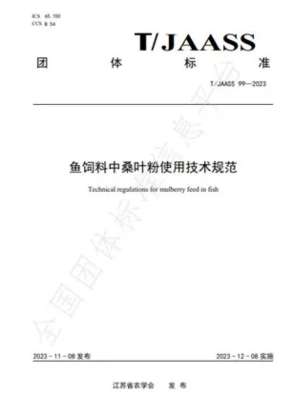 近日,江蘇省農(nóng)學會團體標準《魚飼料中桑葉粉使用技術(shù)規(guī)范》正式發(fā)布,標準編號為“T/JAASS 99—2023”。該標準由江蘇科技大學作為牽頭單位,中國水產(chǎn)科學研究院淡水漁業(yè)研究中心、廣東省農(nóng)業(yè)科學院蠶業(yè)與農(nóng)產(chǎn)品加工研究所、西南大學、農(nóng)業(yè)農(nóng)村部蠶桑產(chǎn)業(yè)產(chǎn)品質(zhì)量監(jiān)督檢驗測試中心(鎮(zhèn)江)作為參編單位共同編制而成。