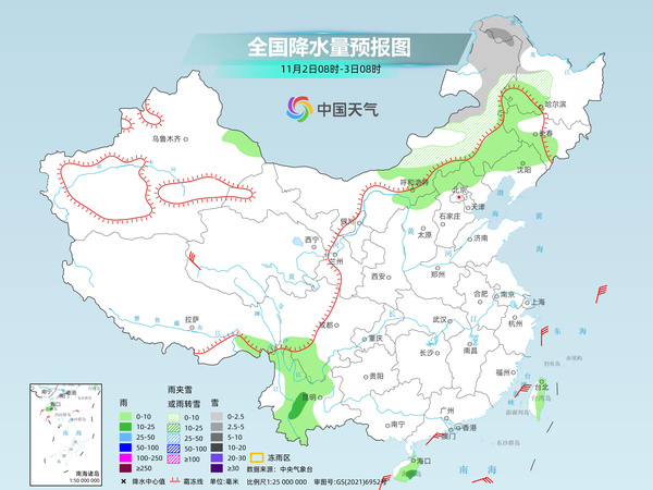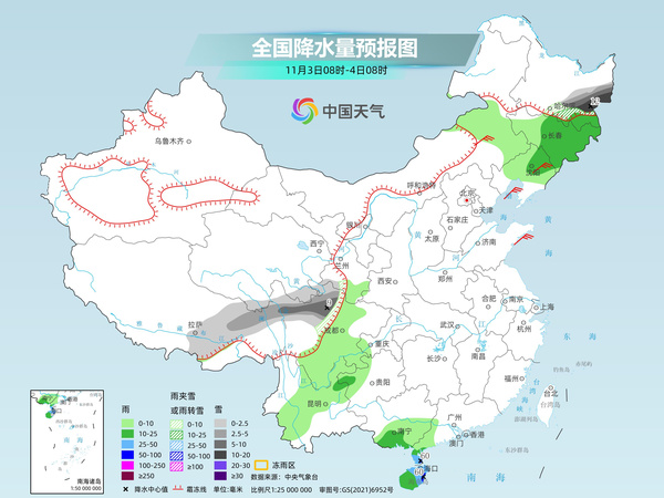明天,內(nèi)蒙古中東部、黑龍江西北部等地部分地區(qū)有小雪或雨夾雪,其中,內(nèi)蒙古東北部、黑龍江西北部等地局部地區(qū)有中雪。內(nèi)蒙古中部、東北地區(qū)西部、西藏東南部、華北北部、四川南部、云南大部、海南島大部、臺灣島東部等地部分地區(qū)有小雨,其中,云南中部、海南島東南部等地部分地區(qū)有中雨。