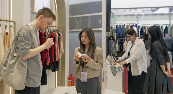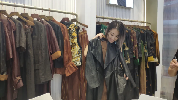 外國采購商對“SILIQUE”品牌香云紗服裝、絲巾仔細(xì)詢問