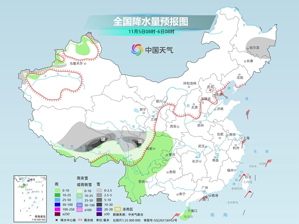 具體來(lái)看,今天,內(nèi)蒙古東北部、黑龍江中部、吉林東部、西藏中南部和東部、川西高原中南部等地部分地區(qū)有小到中雪或雨夾雪,其中,川西高原中部局地有大雪。四川南部、云南北部、廣東西部、海南島中東部等地部分地區(qū)有中到大雨,其中,海南島東部局地有暴雨。