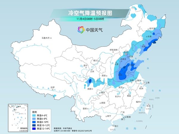 今天(11月4日),強(qiáng)冷空氣持續(xù)發(fā)力,降溫中心東移南壓,華北、東北等地氣溫明顯下降。明后天將迎來(lái)本輪降溫過(guò)程的低點(diǎn),多地會(huì)刷新立秋后氣溫新低。此外,海南島等地今天仍會(huì)有強(qiáng)降雨出現(xiàn),部分地區(qū)累計(jì)雨量大,公眾需高度警惕次生災(zāi)害。