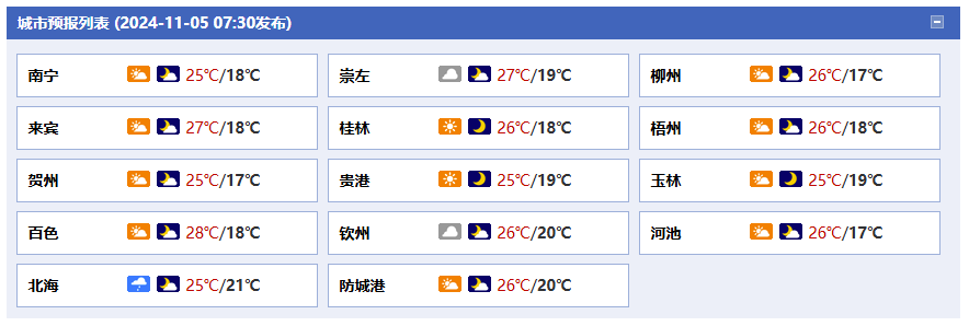 南寧市:今天白天,陰天轉(zhuǎn)多云,今天晚上,多云,東北風(fēng)2~3級,最高氣溫25℃,最低氣溫18℃。