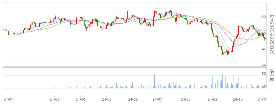 20/22D商檢4A級生絲:今日(周三)生絲指數(shù)稍有回升但仍收于主要均線下方,盤面各遠(yuǎn)近合約價格各有漲跌,主力合約250325持倉量有所增加。
