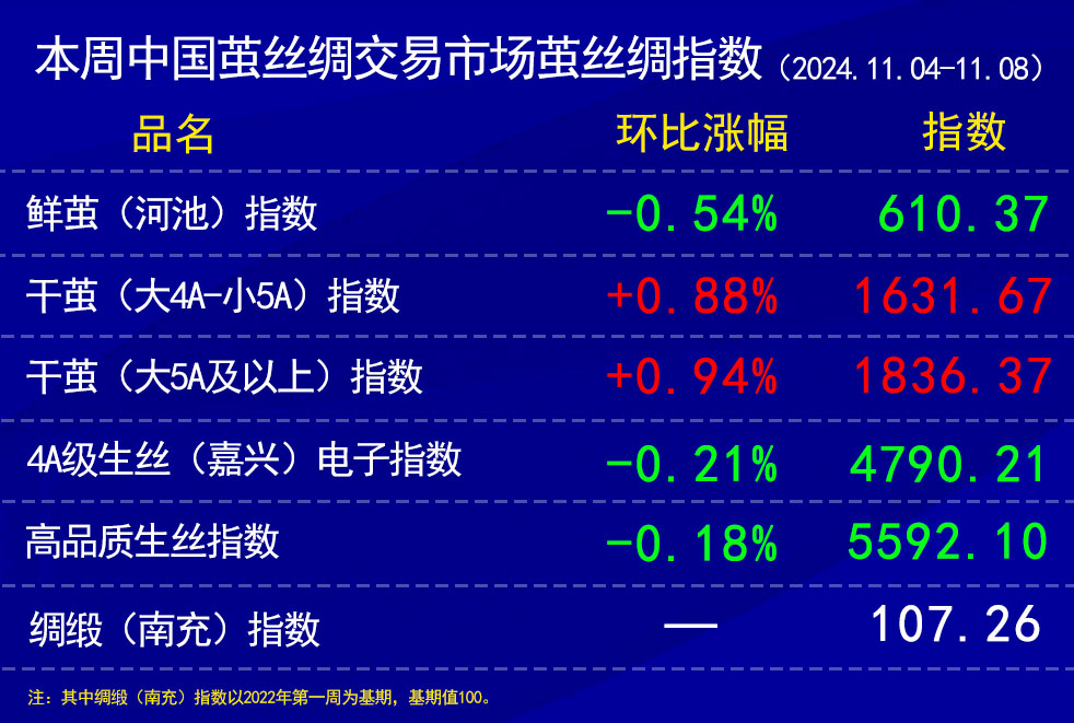 鮮繭指數(shù)上,本周廣西等地基本處于本年度的最后一批秋繭,部分地區(qū)還有一小批或者半批,收購繭本和上周相差不大,部分協(xié)作單位已經(jīng)本年度停收,部分協(xié)作單位繼續(xù)有所收購。經(jīng)過標(biāo)準(zhǔn)化轉(zhuǎn)換后,本周鮮繭價(jià)格指數(shù)略下跌0.54%報(bào)收于610.37點(diǎn)。