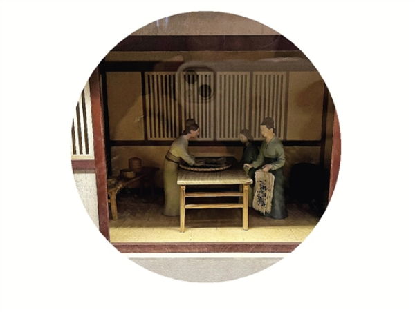 博物館一樓的“錦程:中國絲綢與絲綢之路”主題展覽,一排展現(xiàn)古人養(yǎng)蠶織綢過程的微縮模型圖映入眼簾。講解員官琴介紹,這些微縮模型以南宋高宗吳皇后題注本《蠶織圖》為創(chuàng)作藍本,描繪了南宋初期浙東一帶種桑、養(yǎng)蠶、織造等絲綢生產(chǎn)過程。