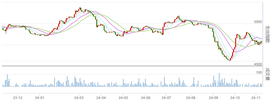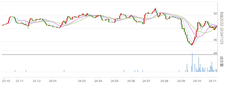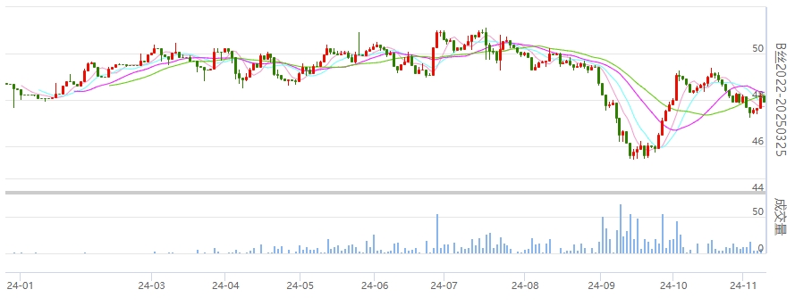 今日(2024年11月11日,周一)中國繭絲綢交易市場生絲電子指數(shù)微跌0.04%收于4788.37點(diǎn)。B絲2022D(商檢4A級生絲):241125合約上漲0.03萬元報(bào)收于48.30萬元;250325合約下跌0.24萬元報(bào)收于47.94萬元;250925合約報(bào)平收于47.61萬元。