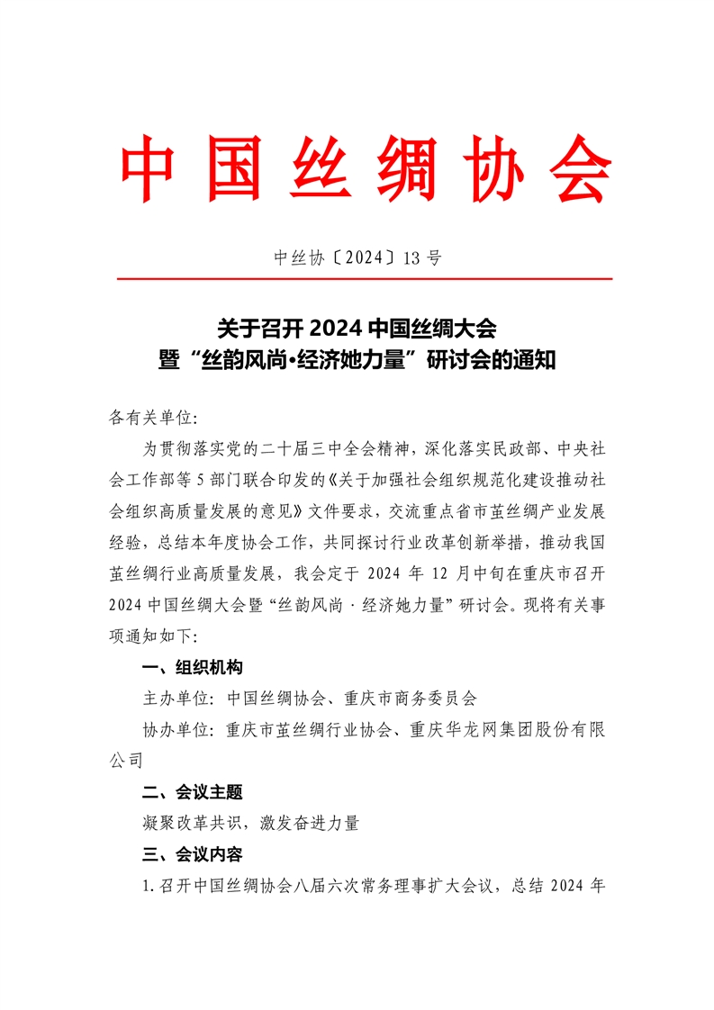 中絲協關于召開 2024中國絲綢大會 暨“絲韻風尚·經濟她力量”研討會的通知