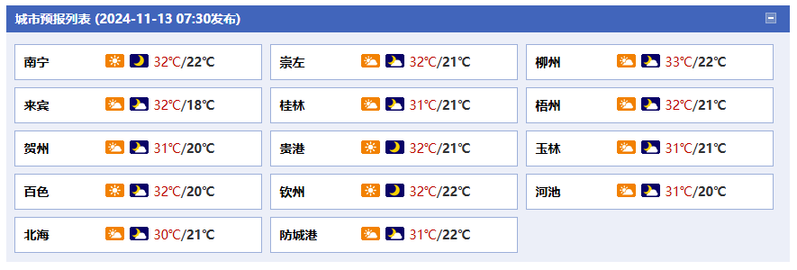 南寧市:今天白天到晚上,晴間多云,偏東風1~2級,最高氣溫33℃,最低氣溫22℃。