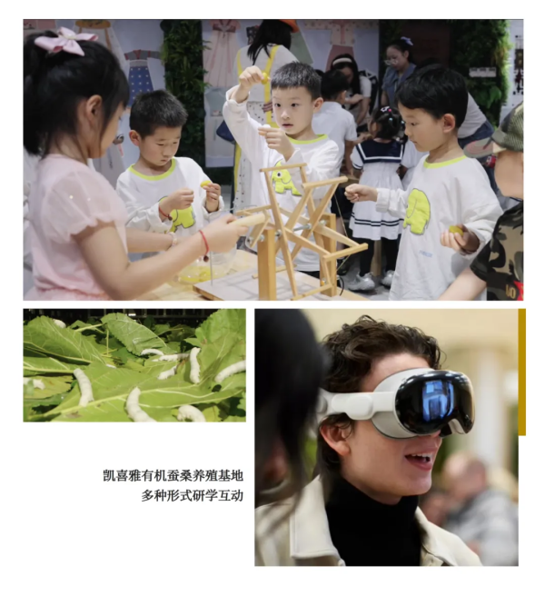 基地以蠶桑生產(chǎn)為主,開展多種經(jīng)營(yíng),其中蠶桑文化研學(xué)板塊是一大亮點(diǎn)?;亟ㄓ行Q寶寶科普館、絲工坊等,內(nèi)設(shè)VR體驗(yàn)館和互動(dòng)游戲設(shè)施,借助新興科技力量,讓小朋友“身臨其境”地了解蠶寶寶的一生。