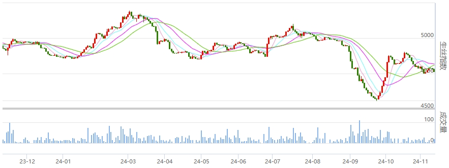 今日(2024年11月13日,周三)中國(guó)繭絲綢交易市場(chǎng)生絲電子指數(shù)下跌0.39%收于4762.68點(diǎn)。B絲2022D(商檢4A級(jí)生絲):241125合約下跌0.21萬(wàn)元報(bào)收于48.06萬(wàn)元;250325合約下跌0.27萬(wàn)元報(bào)收于47.43萬(wàn)元;250925合約下跌0.54萬(wàn)元報(bào)收于46.89萬(wàn)元。