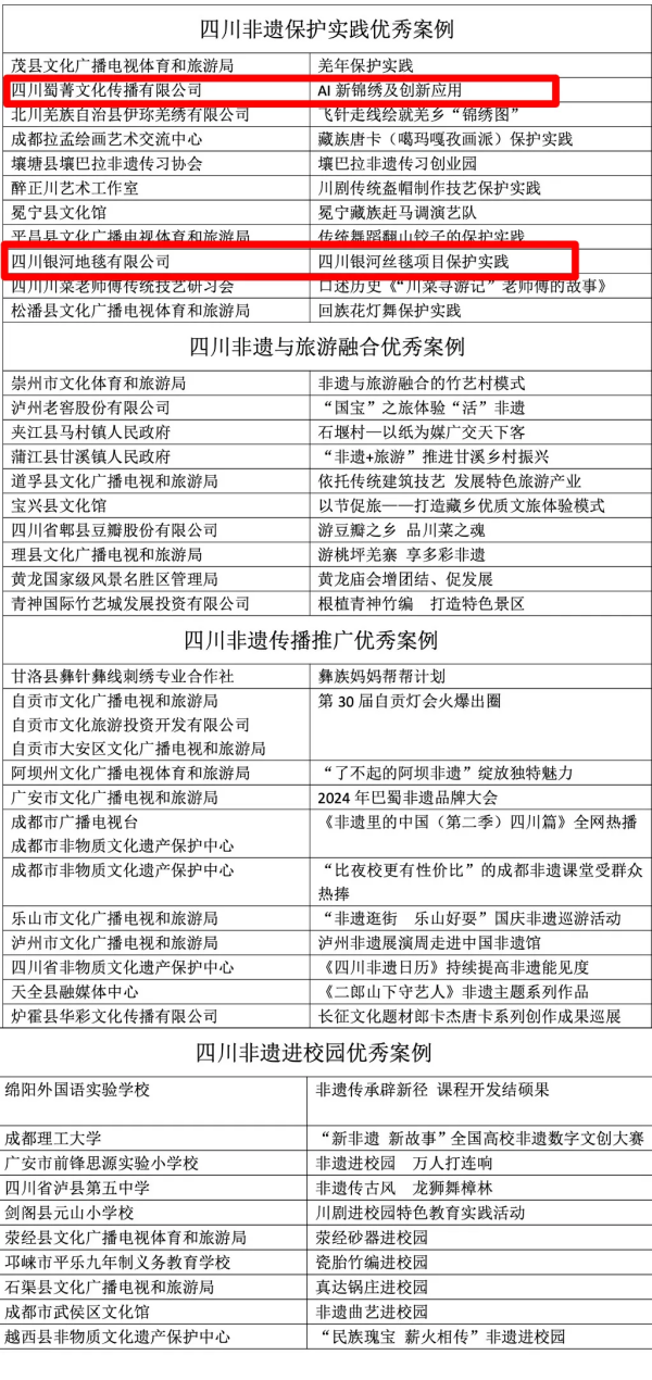 據(jù)介紹,此次優(yōu)秀案例推選收到了全省共計383個項目報名,它們在非遺保護傳承方面的探索鮮活而生動。其中四川蜀菁文化傳播有限公司的“AI新錦繡及創(chuàng)新應用”和四川銀河地毯有限公司的“四川銀河絲毯項目保護實踐”成功入選。