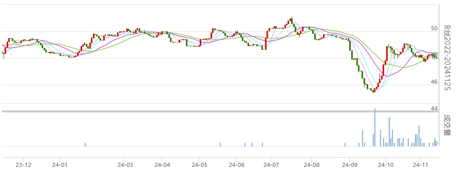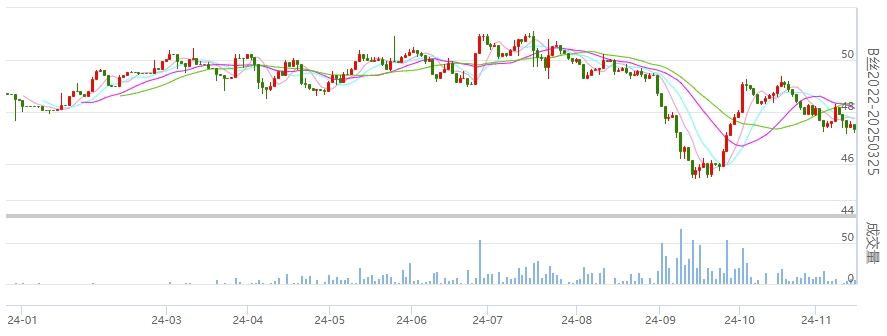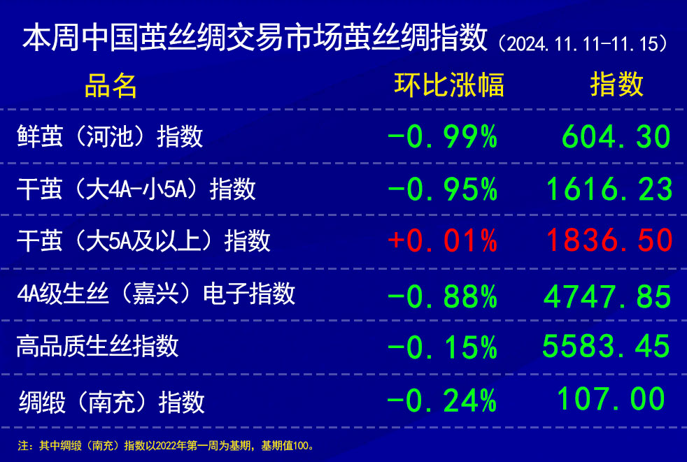 今日(2024年11月15日,周五)中國繭絲綢交易市場生絲電子指數(shù)下跌0.22%收于4747.85點(diǎn),本周生絲指數(shù)下跌0.88%。B絲2022D(商檢4A級生絲):241125合約報平收于48.00萬元;250325合約下跌0.21萬元報收于47.34萬元;250925合約下跌0.24萬元報收于46.68萬元。