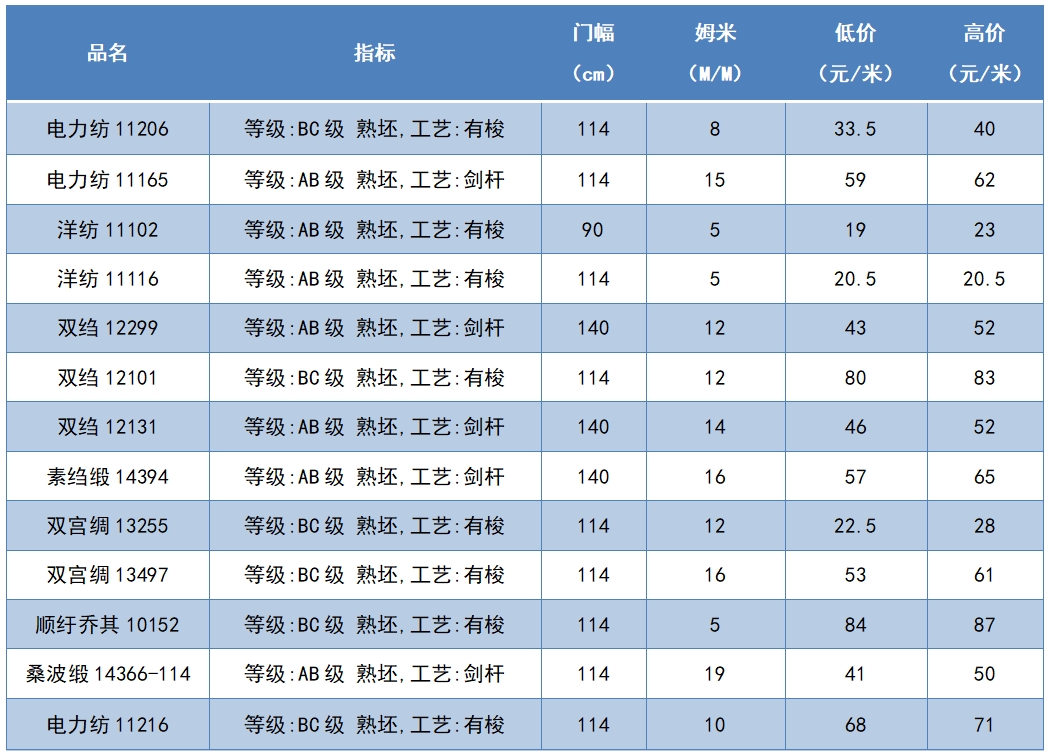 本周綢緞指數(shù)協(xié)作單位成交價格區(qū)間