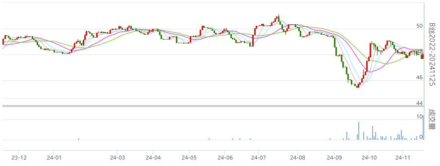 今日(2024年11月19日,周二)中國繭絲綢交易市場(chǎng)生絲電子指數(shù)上漲0.25%收于4713.25點(diǎn)。B絲2022D(商檢4A級(jí)生絲):241125合約上漲0.33萬元報(bào)收于48.03萬元;250325合約上漲0.12萬元報(bào)收于46.77萬元;250925合約上漲0.27萬元報(bào)收于46.44萬元。