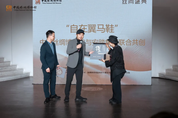 中國(guó)絲綢博物館張成名副館長(zhǎng)與安踏集團(tuán)高級(jí)總監(jiān)鄭永先共同開啟發(fā)布儀式,兩位邀請(qǐng)中央美術(shù)學(xué)院呂越教授作為第一位雅士上臺(tái)贈(zèng)予其翼馬鞋。呂越教授如此評(píng)價(jià)“穿翼馬鞋,走新絲路,舒適自在”。
