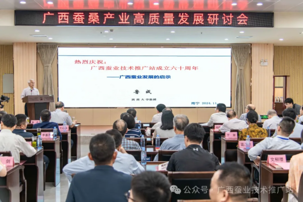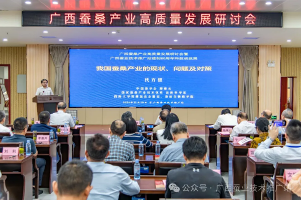 11月18日,由廣西蠶業(yè)技術(shù)推廣站主辦的廣西蠶桑產(chǎn)業(yè)高質(zhì)量發(fā)展研討會(huì)在南寧召開。廣西自治區(qū)農(nóng)業(yè)農(nóng)村廳黨組成員、副廳長韋波出席會(huì)議并致辭。廣西蠶業(yè)技術(shù)推廣站副站長韋偉主持會(huì)議。自治區(qū)農(nóng)業(yè)農(nóng)村廳各相關(guān)處室負(fù)責(zé)同志,全國各地專家學(xué)者、廣西蠶業(yè)技術(shù)推廣站各科室負(fù)責(zé)人及科研骨干140余人參加會(huì)議。