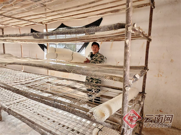 “每批蠶繭養(yǎng)殖期間,公司均會派技術(shù)人員到養(yǎng)殖戶家中給予技術(shù)指導(dǎo),村‘兩委’則全力配合做好宣傳指導(dǎo)工作,保障蠶農(nóng)熟練掌握養(yǎng)殖技術(shù)。通過與兩家公司合作,提前簽訂保底收購價格合約,極大地調(diào)動了農(nóng)民的養(yǎng)殖積極性?!蔽饕卮妩h總支書記、主任付永軍介紹,為降低養(yǎng)殖風(fēng)險,村里推行“集中共育”模式,并采用“合作社+公司+農(nóng)戶”的合作形式,村委會與保山海宏蠶種生產(chǎn)經(jīng)營有限公司和保山凱喜雅絲綢有限公司深度合作。