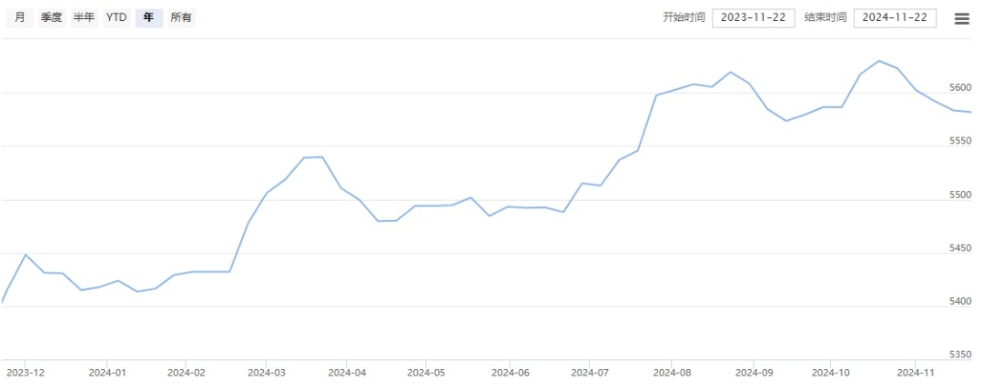 高品質(zhì)生絲價格指數(shù)上,高品質(zhì)生絲保持原料供應(yīng)量整體有所下降、產(chǎn)能整體有所下降的格局。協(xié)作單位中,部分工廠交售國儲絲后的生絲可供出售量下降,部分干繭絲工廠本身產(chǎn)能有限、在原料端支撐下生絲存貨也不多,報價繼續(xù)堅挺,部分工廠繼續(xù)順價銷售。本周協(xié)作單位所報成交筆數(shù)環(huán)比下降,指數(shù)微跌0.03%,報收于5581.74,基本與上周持平。