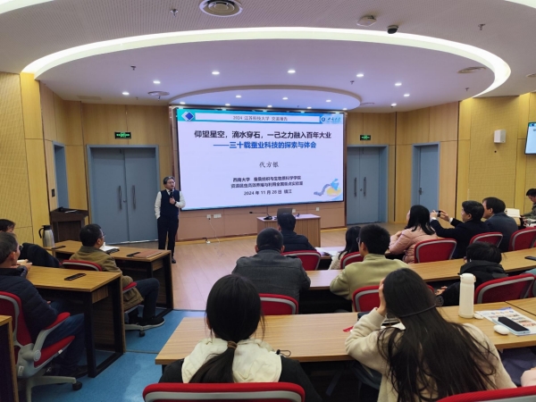 11月28日下午,國(guó)家蠶桑產(chǎn)業(yè)技術(shù)體系首席科學(xué)家、中國(guó)蠶學(xué)會(huì)理事長(zhǎng)、西南大學(xué)資源昆蟲高效養(yǎng)殖與利用全國(guó)重點(diǎn)實(shí)驗(yàn)室主任、西南大學(xué)蠶桑紡織與生物質(zhì)科學(xué)學(xué)院院長(zhǎng)代方銀教授,應(yīng)邀赴江蘇科技大學(xué),并作題為“仰望星空,滴水穿石,一己之力融入百年大業(yè)——三十載蠶業(yè)科技的探索與體會(huì)”的學(xué)術(shù)報(bào)告。