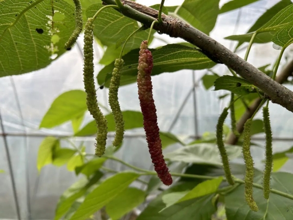 在與該公司合作的8年里,師生成功選育了一個果、葉兩用桑新品種“1208”,不僅桑葉產(chǎn)量比普通養(yǎng)蠶桑增加10%以上,而且每畝可以盛產(chǎn)桑果3000-5000 斤,并且桑果產(chǎn)量及口感得到提升,突破了幾千年來栽桑養(yǎng)蠶的單一模式,桑葉不僅可以用來養(yǎng)蠶,桑果還可以采摘和進行深加工,畝均效益達到4-5萬元,大大提升了蠶桑綜合效益。