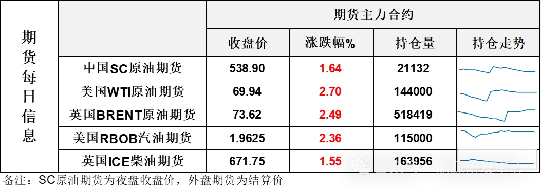 【1】WTI主力原油期貨收漲1.84美元,漲幅2.7%,報(bào)69.94美元/桶;布倫特主力原油期貨收漲1.79美元,漲幅2.49%,報(bào)73.62美元/桶;INE原油期貨收漲1.64%,報(bào)538.9元。