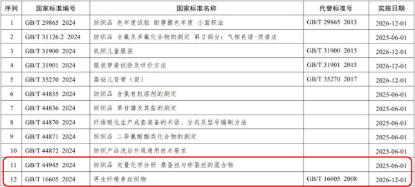 其中,GB/T 44945-2024《紡織品 定量化學(xué)分析 桑蠶絲與柞蠶絲的混合物》和GB/T 16605-2024《再生纖維素絲織物》兩項(xiàng)國(guó)標(biāo)均由全國(guó)絲綢標(biāo)委會(huì)秘書(shū)處承擔(dān)單位浙江絲綢科技有限公司牽頭組織制修訂。