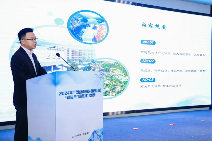 11月28日, 2024年廣西紡織服裝(繭絲綢)產(chǎn)業(yè)“請進來”招商推介活動在南寧市成功舉辦。此次活動由廣西壯族自治區(qū)工業(yè)和信息化廳聯(lián)合南寧、梧州、河池、百色、來賓市人民政府主辦。四川省絲綢協(xié)會組織四川省絲綢科學研究院、寧南縣南絲路集團有限公司、成都一和海悅絲綢有限公司等科研院所、龍頭企業(yè)代表、供應鏈企業(yè)代表參加招商對接活動。