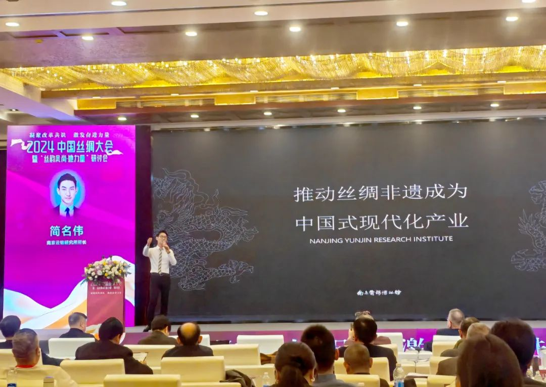 南京云錦研究所所長(zhǎng)簡(jiǎn)名偉發(fā)表題為“推動(dòng)絲綢非遺成為中國(guó)式現(xiàn)代化產(chǎn)業(yè)”主題演講