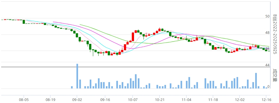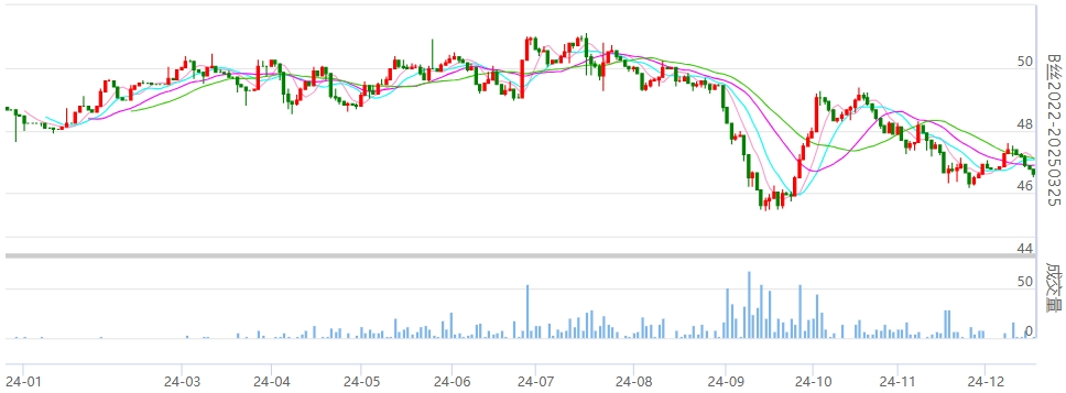 今日(2024年12月17日,周二)中國(guó)繭絲綢交易市場(chǎng)生絲電子指數(shù)下跌0.15%收于4673.57點(diǎn)。B絲2022D(商檢4A級(jí)生絲):241225合約下跌0.06萬(wàn)元報(bào)收于47.55萬(wàn)元;250325合約下跌0.15萬(wàn)元報(bào)收于46.62萬(wàn)元;250925合約下跌0.03萬(wàn)元報(bào)收于45.96萬(wàn)元。