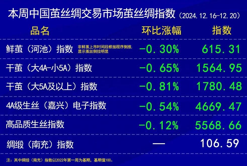同樣,高品質(zhì)生絲指數(shù)同樣有所略收跌,部分干繭絲工廠根據(jù)品質(zhì)穩(wěn)定性繼續(xù)原價銷售,部分干繭絲工廠有所略調(diào)價。