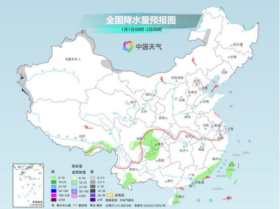 元旦當(dāng)天,新疆北疆北部和南疆西部山區(qū)、川西高原南部、內(nèi)蒙古東北部等地部分地區(qū)有小雪或雨夾雪,其中,新疆南疆西部山區(qū)等地部分地區(qū)有中到大雪。西藏東南部、四川盆地大部、貴州西北部、云南南部、廣東南部沿海、福建沿海、海南島中東部、臺(tái)灣島等地部分地區(qū)有小雨。