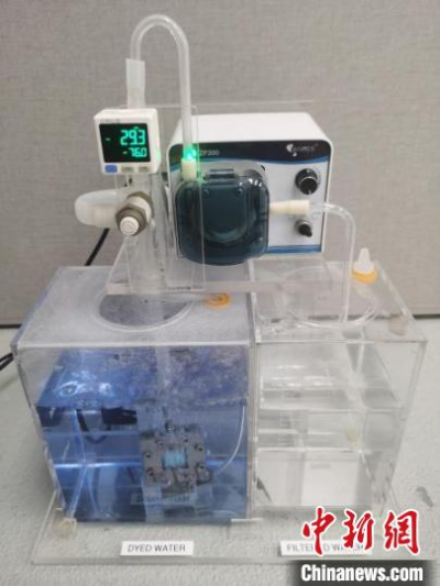 圖為真空驅(qū)動納米過濾的原型,顯示將染色水進(jìn)行凈化的高效成果
