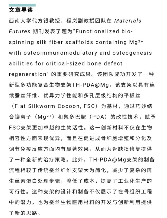 蠶??蒲胸髂洗髮W代方銀教授、程嵐副教授團隊:采用家蠶平面吐絲(平板絲)基材構建具有免疫調(diào)節(jié)和成骨功能的多功能復合生物支架