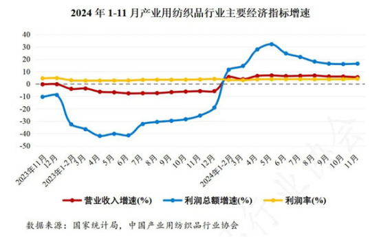 經(jīng)濟(jì)效益方面,根據(jù)國(guó)家統(tǒng)計(jì)局?jǐn)?shù)據(jù),2024年1-11月產(chǎn)業(yè)用紡織品行業(yè)規(guī)模以上企業(yè)的營(yíng)業(yè)收入和利潤(rùn)總額分別同比增長(zhǎng)5.5%和16.4%,營(yíng)業(yè)利潤(rùn)率為4.2%,同比增加0.4個(gè)百分點(diǎn),行業(yè)盈利狀況有所改善,但與疫情前相比仍有較大差距。