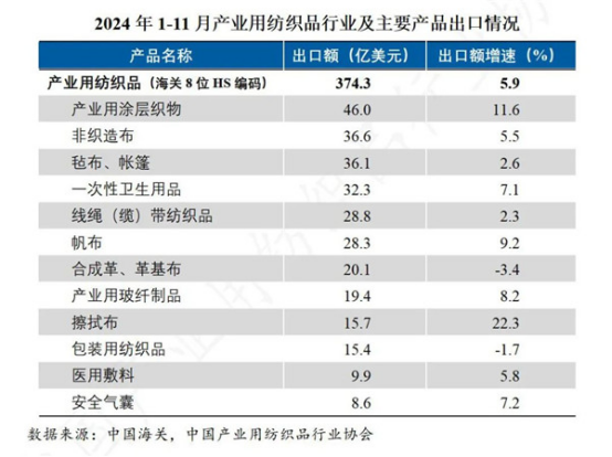 國(guó)際貿(mào)易方面,根據(jù)中國(guó)海關(guān)數(shù)據(jù)(海關(guān)8位HS編碼統(tǒng)計(jì)數(shù)據(jù)),2024年1-11月產(chǎn)業(yè)用紡織品行業(yè)出口額為374.3億美元,同比增長(zhǎng)5.9%;進(jìn)口額為46.1億美元,同比下降3.6%。