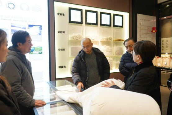 在太湖雪蠶桑文化園,畢飛宇、程永新、王堯在太湖雪絲綢股份有限公司董事長(zhǎng)胡毓芳的帶領(lǐng)下,參觀了蠶桑文化展廳及養(yǎng)蠶、拉綿、蠶繭手作等展區(qū),深入了解震澤蠶桑絲綢產(chǎn)業(yè)的發(fā)展歷程以及太湖雪的品牌成長(zhǎng)之路。